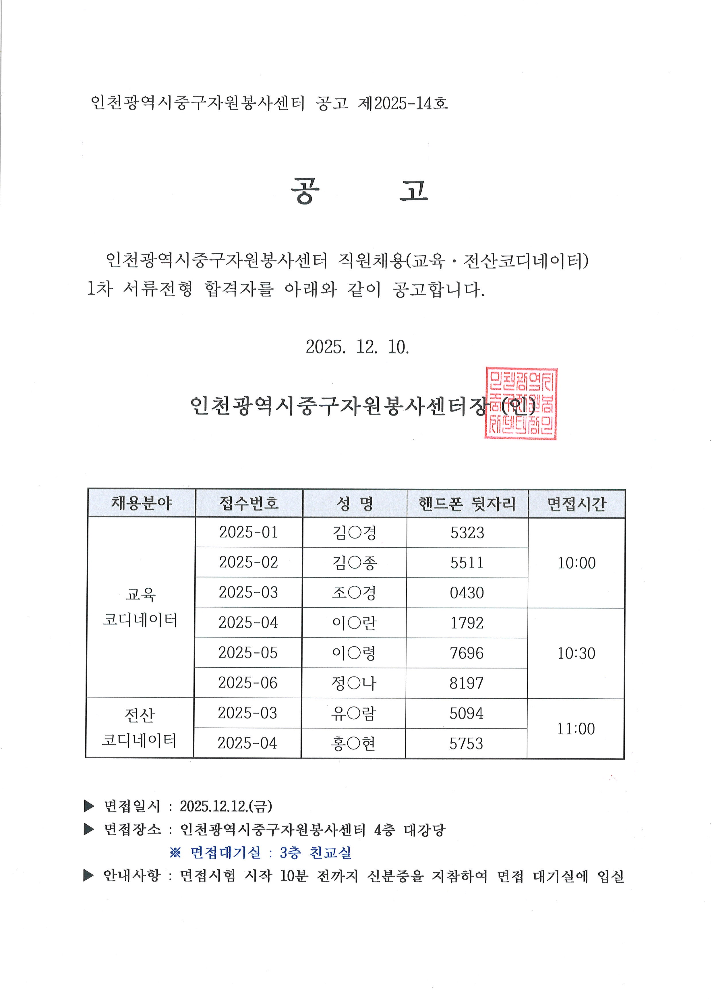 2025년 직원채용(교육·전산코디네이터) 1차 서류전형 합격자 발표 첨부파일 1개 (다운로드 1회) 작성자 : 운영자 / 등록일 : 2025.12.10 (08:48) / 조회 : 210 목록 답변