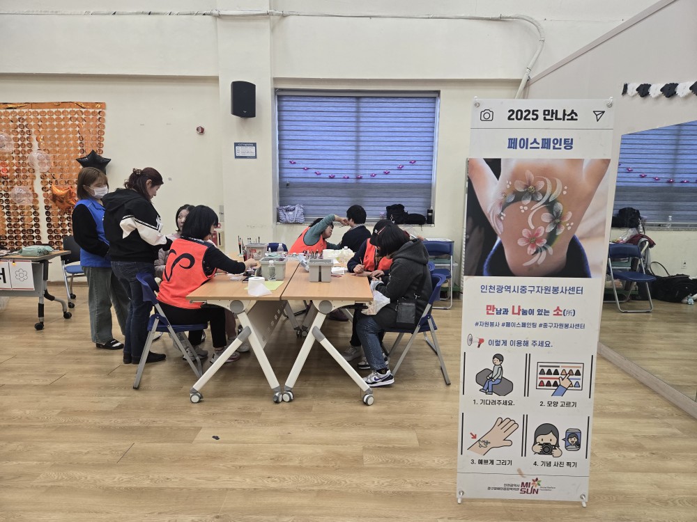 | Contact Us 센터소개자원봉사활동교육 및 프로그램인정보상정보센터커뮤니티 인사말연혁조직도찾아오시는 길자원봉사란?자원봉사참여안내자원봉사일감 분류체계시간인증 표준표수요처(활동처)단체 협의회자원봉사 교육 참여 안내자원봉사센터 사업 안내재능기부자원봉사증 발급할인가맹점병 간호비 지원사업상해보험표창장ㆍ인증패공지사항이달의 행사언론보도서식 자료실Q&A활동 앨범클린신고센터 활동 앨범 인천중구자원봉사센터의 활동 사진을 모았습니다. 페이스페인팅 부스운영 첨부파일 4개 (다운로드 0회) 작성자 : 운영자 / 등록일 : 2025.10.28 (18:04) / 조회 : 36 10월28일(화) 10:00~17:00까지 중구장애인복지관 「2025만남과 나눔이 있는소」 행사에 페이스페인팅 체험부스를 운영하였습니다.그동안 연습으로 갈고닦은 실력을 발휘하며 재능기부를 즐겁고 열정적으로 참여해주신 봉사자분들께 감사드립니다.고생많으셨습니다^^ 목록 답변 개인정보처리방침