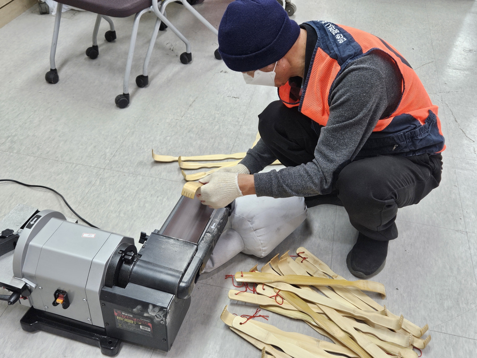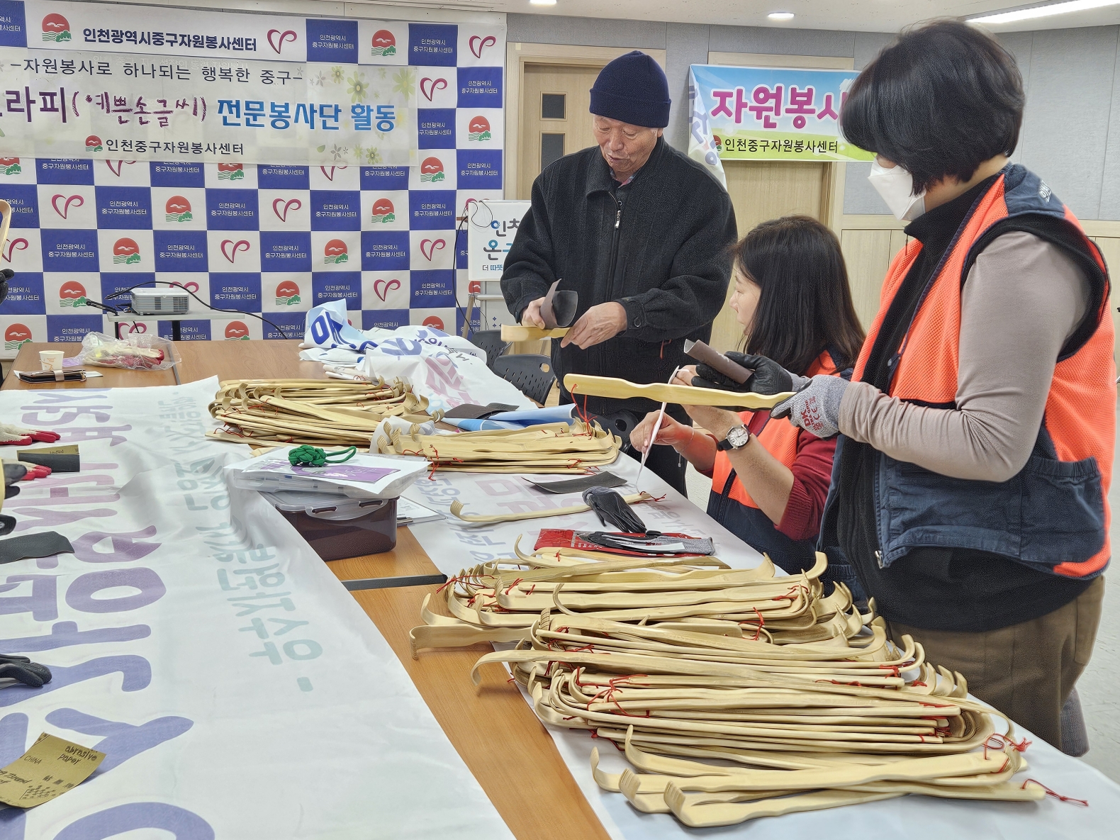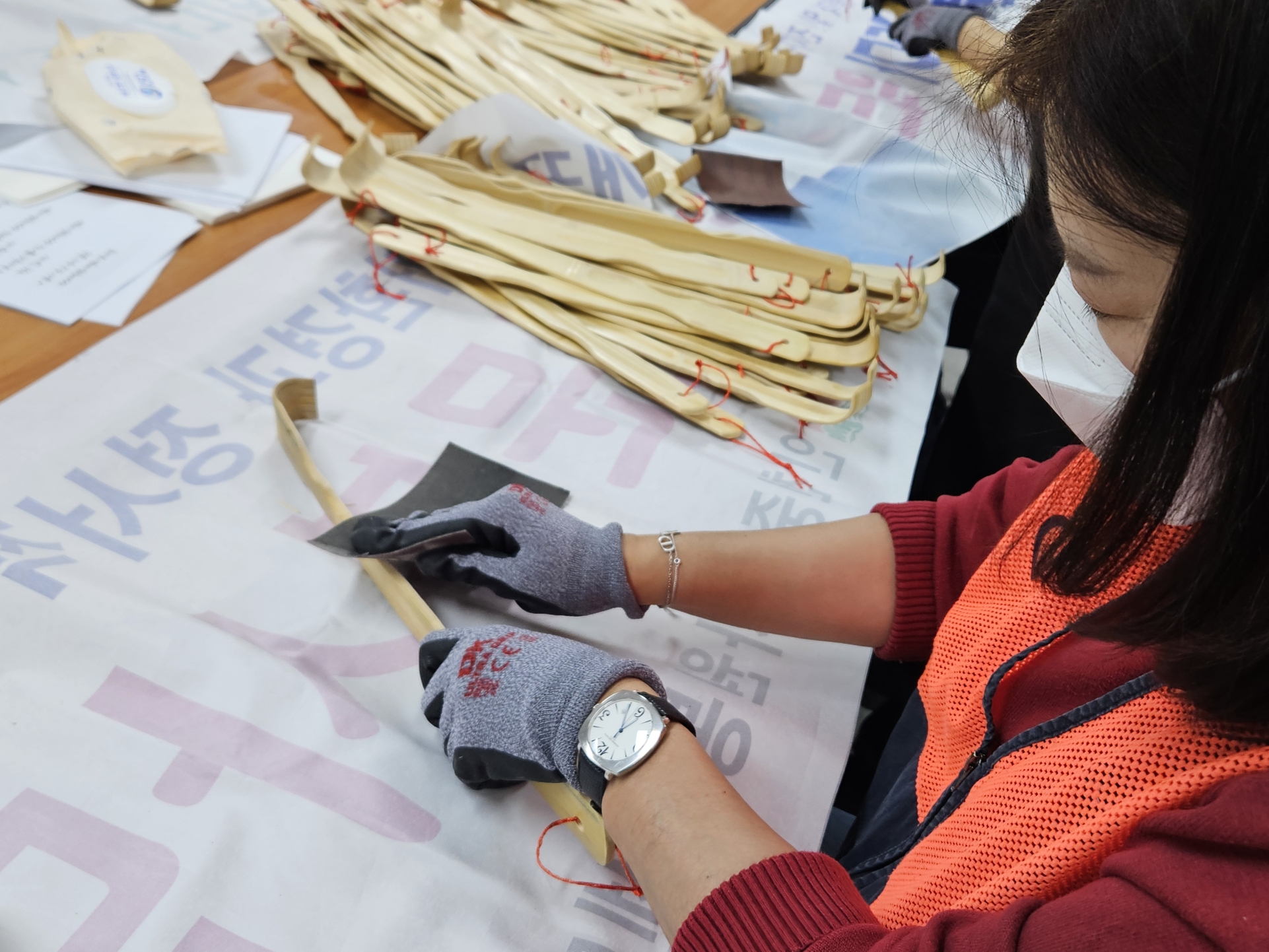 먼저 등긁개 표면을 사포로 꼼꼼히 다듬는 작업을 진행했으며, 이후 어르신의 정서에 어울리는